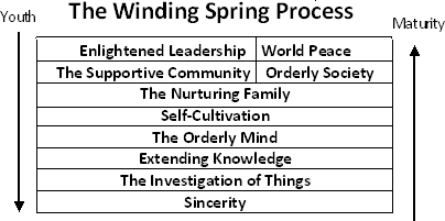 1. Sincerity 2. The investigation of things 3. Extending knowledge 4. The orderly mind 5. Self-cultivation 6. Nurturing family 7. Orderly society 8. World peace.